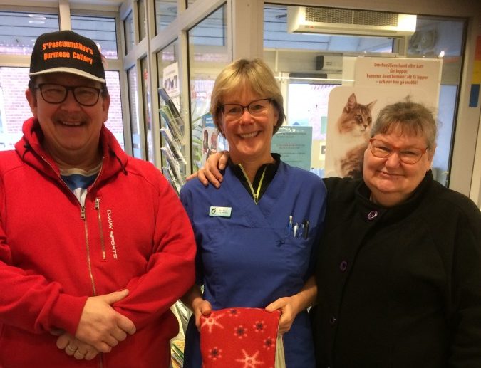 Det var en chansning att öppna klinik enbart för katter. Men bedömningen visade sig vara rätt. Nu tioårsjubilerar Eva Heger på Kattens Veterinär i Kävlinge. På bilden syns hon tillsammans Alf och Yrsa Hedlund, som överräcker en påse som kliniken använder för att katterna ska hålla värmen och kan gömma sig i.